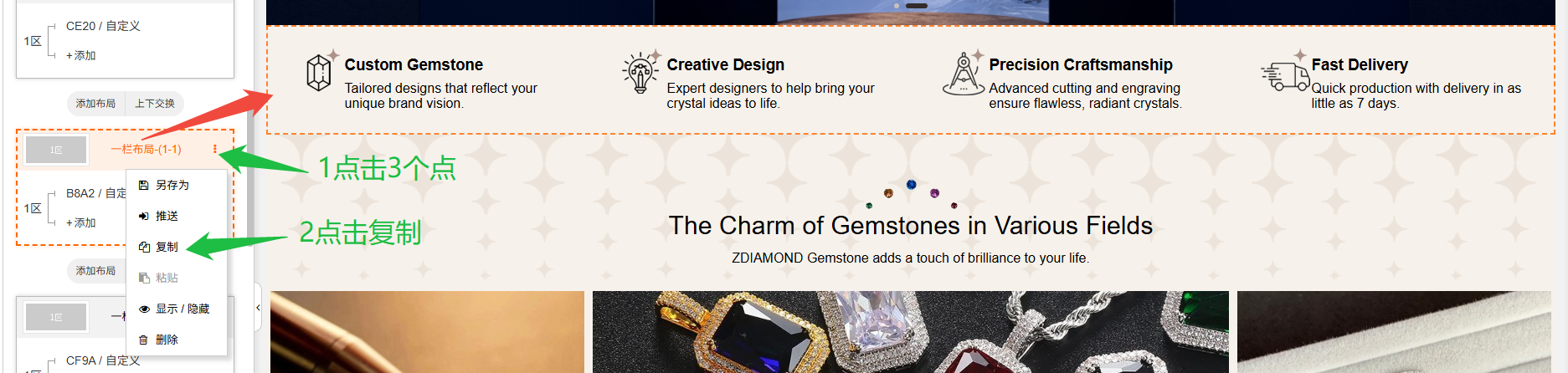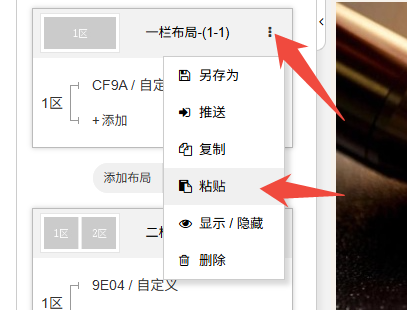 首先我们进入装修后台内,并且找到一个想要的布局,从右上角三个点点击,并点击复制按钮,如图: